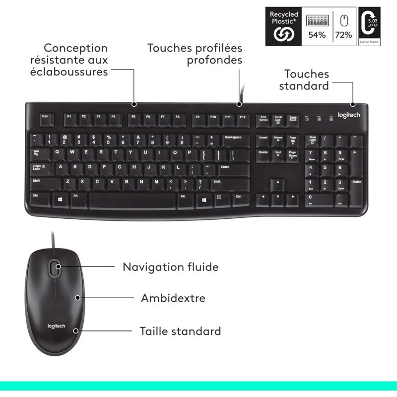 Les pièces en plastique de MK120 contiennent du plastique post-consommation certifié recyclé: 72% pour la souris et 54% pour le clavier*