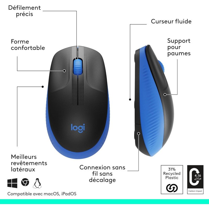 Logitech M190 Souris sans fil, design ambidextre, durée de la batterie 18 mois avec mode économie d’énergie, récepteur USB, contrôle précis du curseur + défilement, large molette de défilement - Bleu