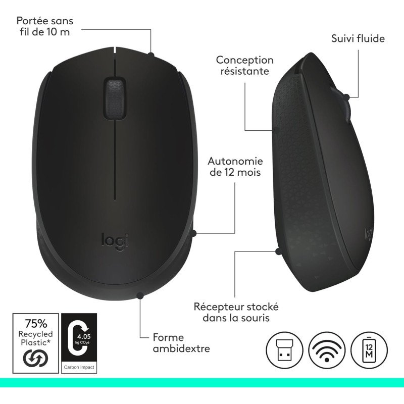 Logitech M171 Souris Sans Fil pour PC, Mac, Ordinateur portable, 2,4 GHz avec Mini-récepteur USB, Suivi Optique, Autonomie de Piles de 12 mois, Ambidextre - Noire